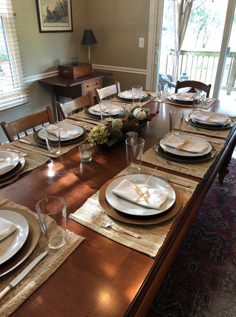 For the table setting, I wanted the view of our property to take a starring role, so I did a simple neutral setting that hinted at the fall splendor to come. Simple white plates, copper chargers and natural woven grass mats were paired with glass tumblers and my husband’s grandmother’s early 20th century silver.