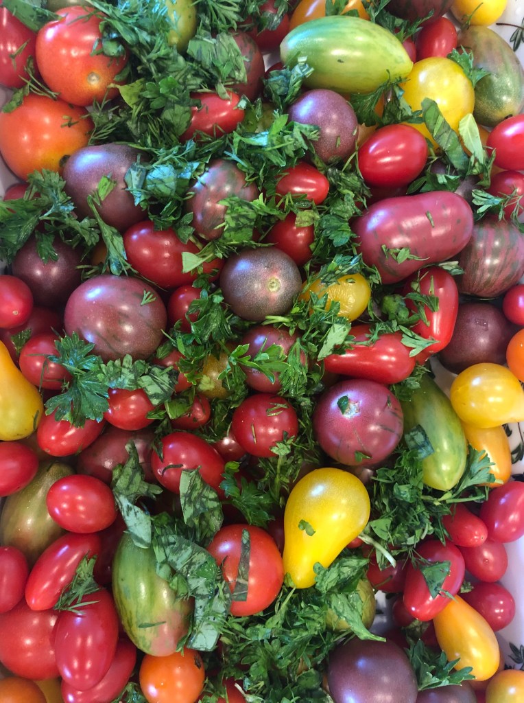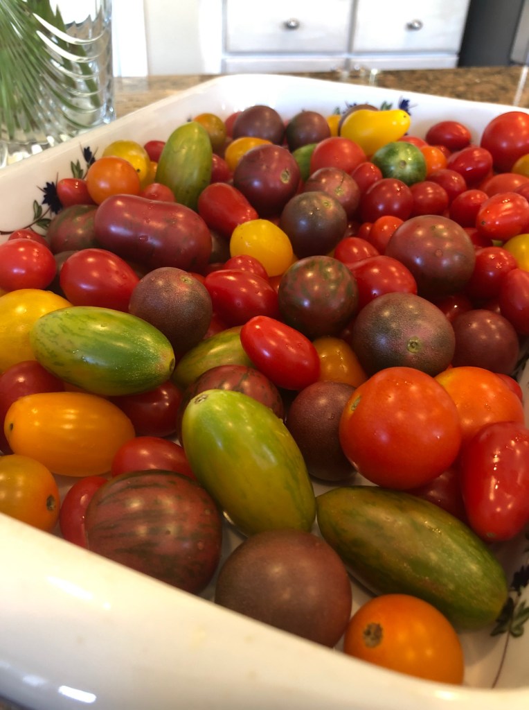 I’m a firm believer in making as much ahead as possible so that I can enjoy the party as much as my guests, so I had roasted the chickpeas and cauliflower for the salad and the tomatoes for the pasta dish before guests arrived. The heirloom cherry tomatoes I used deserved their own photoshoot.