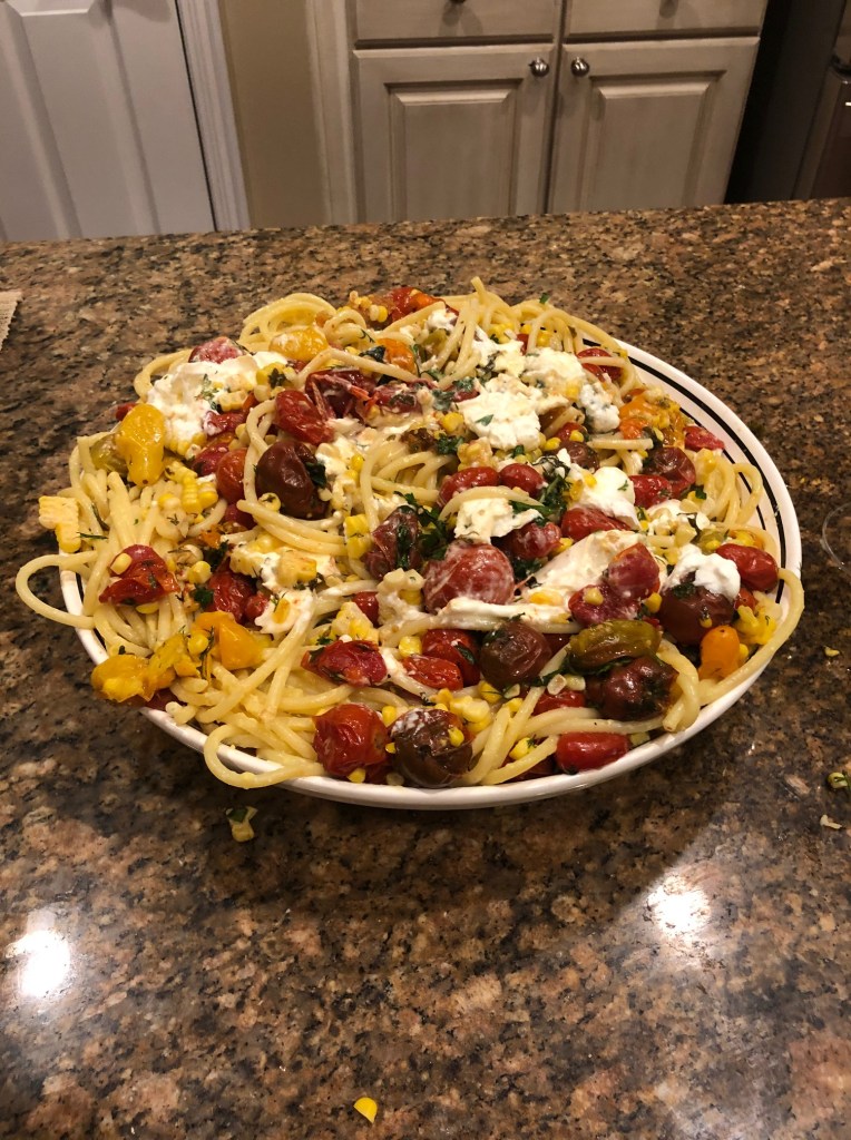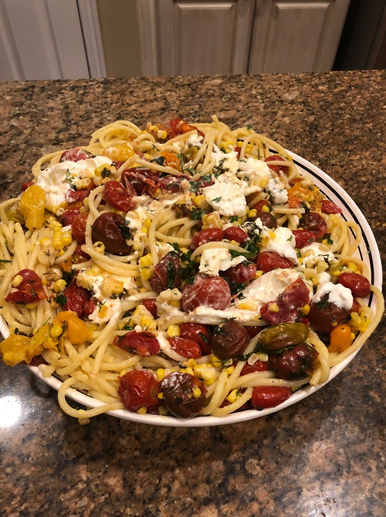 We started on the patio with a simple cheese board with crackers. For the main course, I served Summer Carbonara (full of roasted cherry tomatoes and burrata cheese) from Half-Baked Harvest. With a large salad, this recipe can feed a crowd. I served it with Half Baked Harvest’s Roasted Cauliflower Salad with Creamy Honey Mustard Vinaigrette.